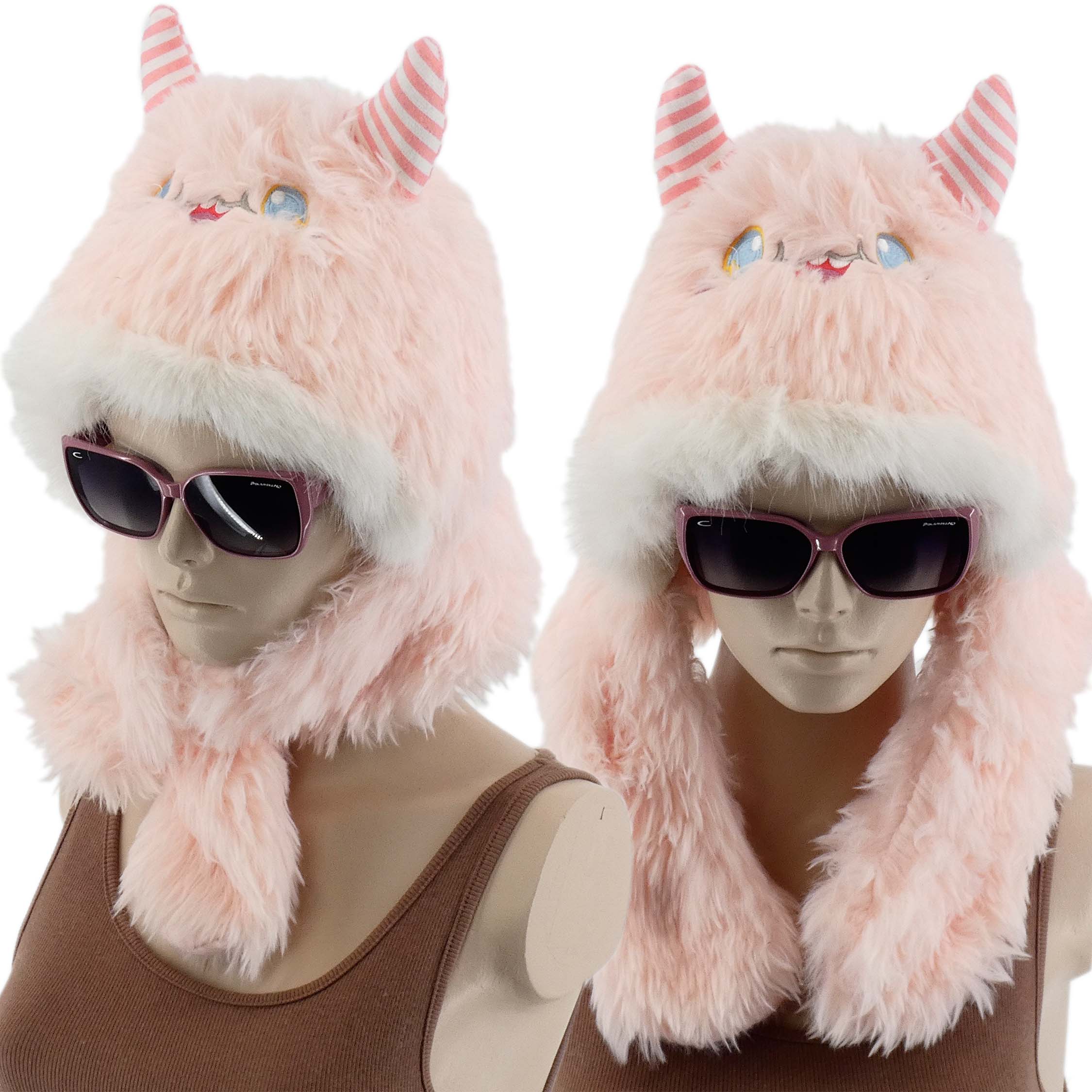 CIEPŁA ZIMOWA CZAPKA DAMSKA Z FUTERKIEM RÓŻOWA MORDKA ROGI ZWIERZAK