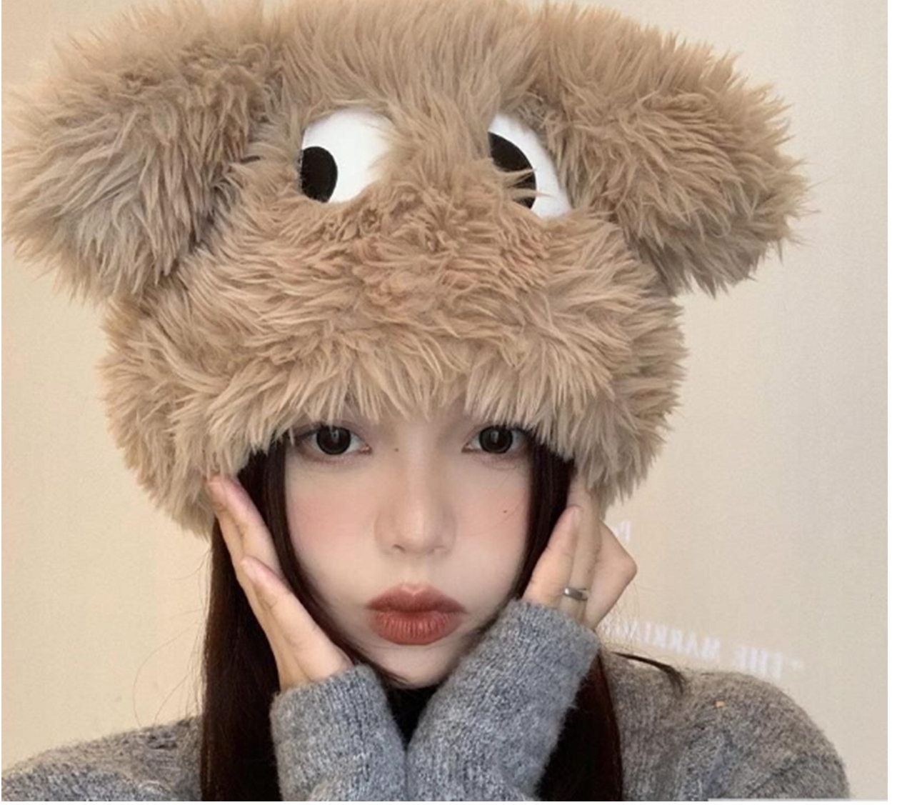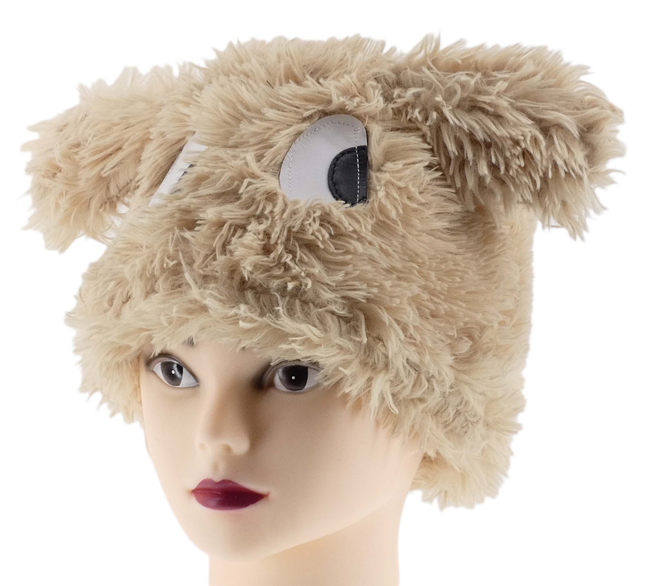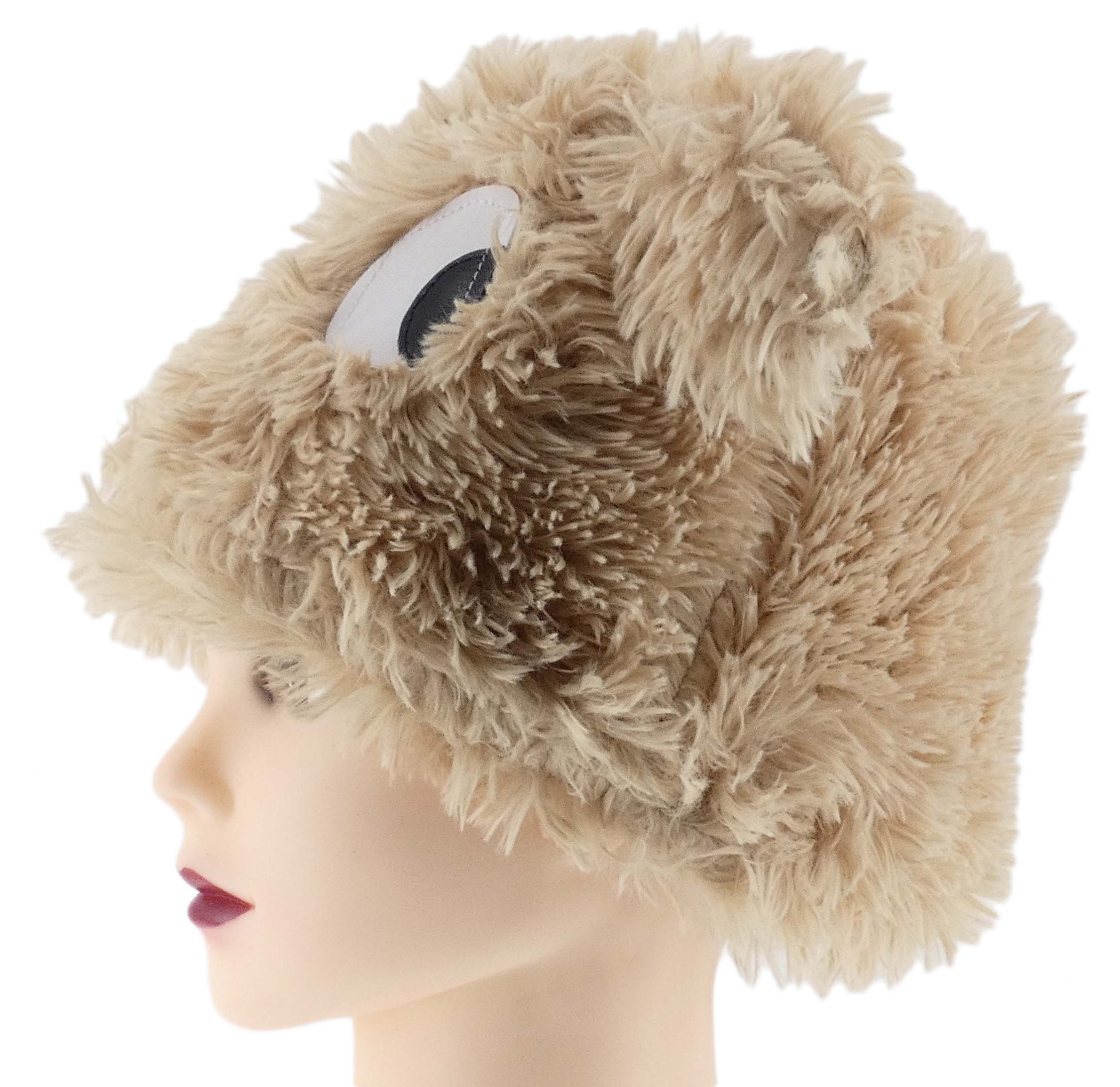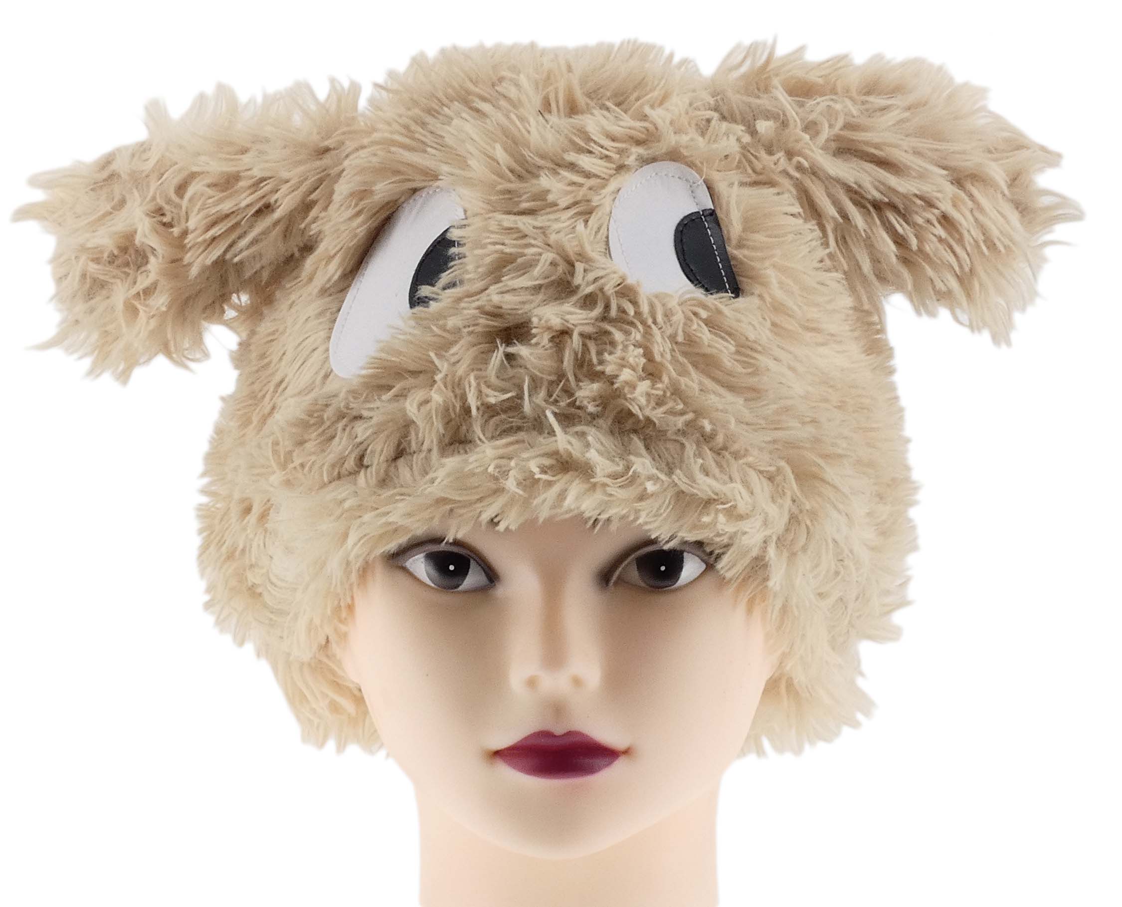 CIEPŁA ZIMOWA CZAPKA KOBIECA Z FUTERKIEM ECO ECRU MORDKA DUŻE OCZY NA STOK