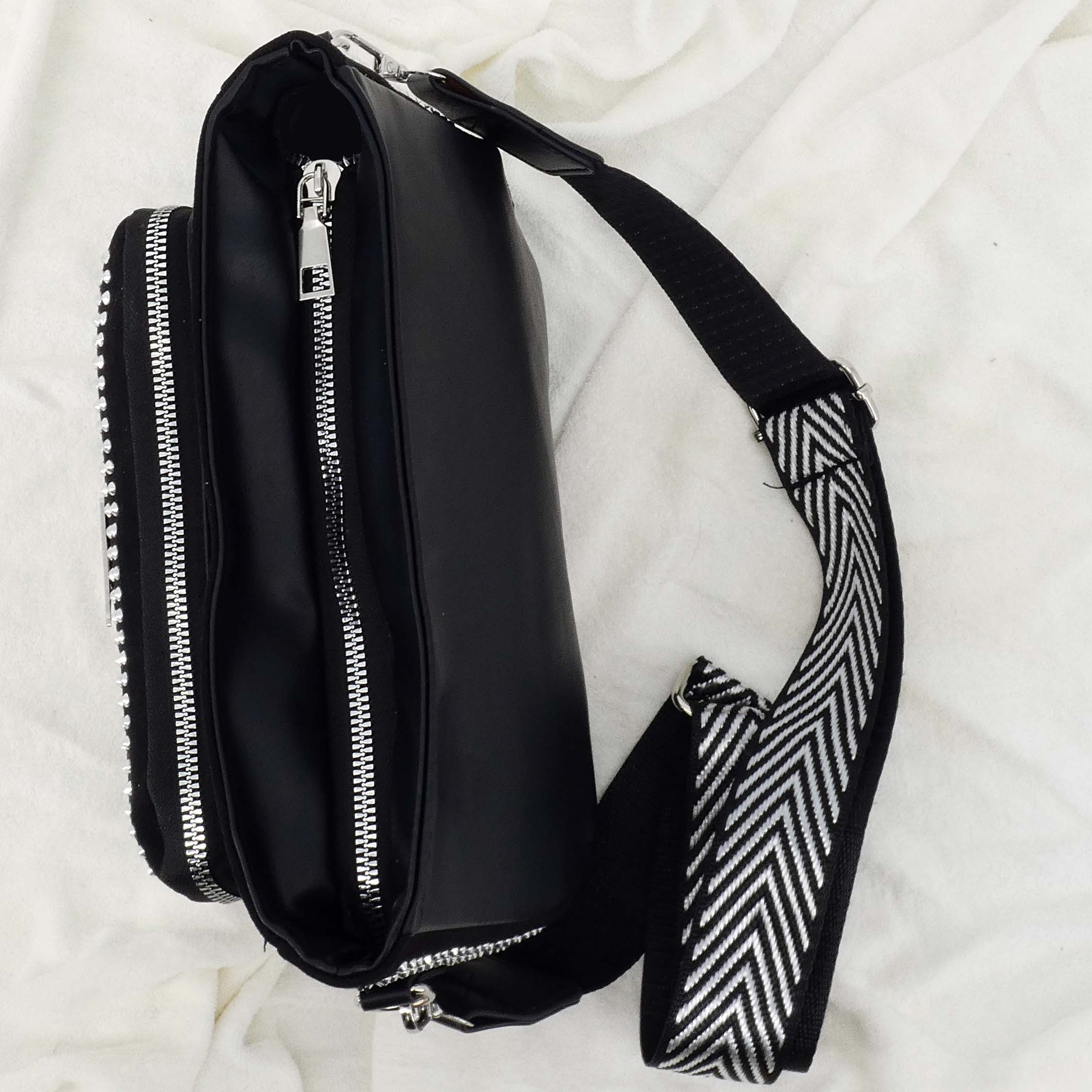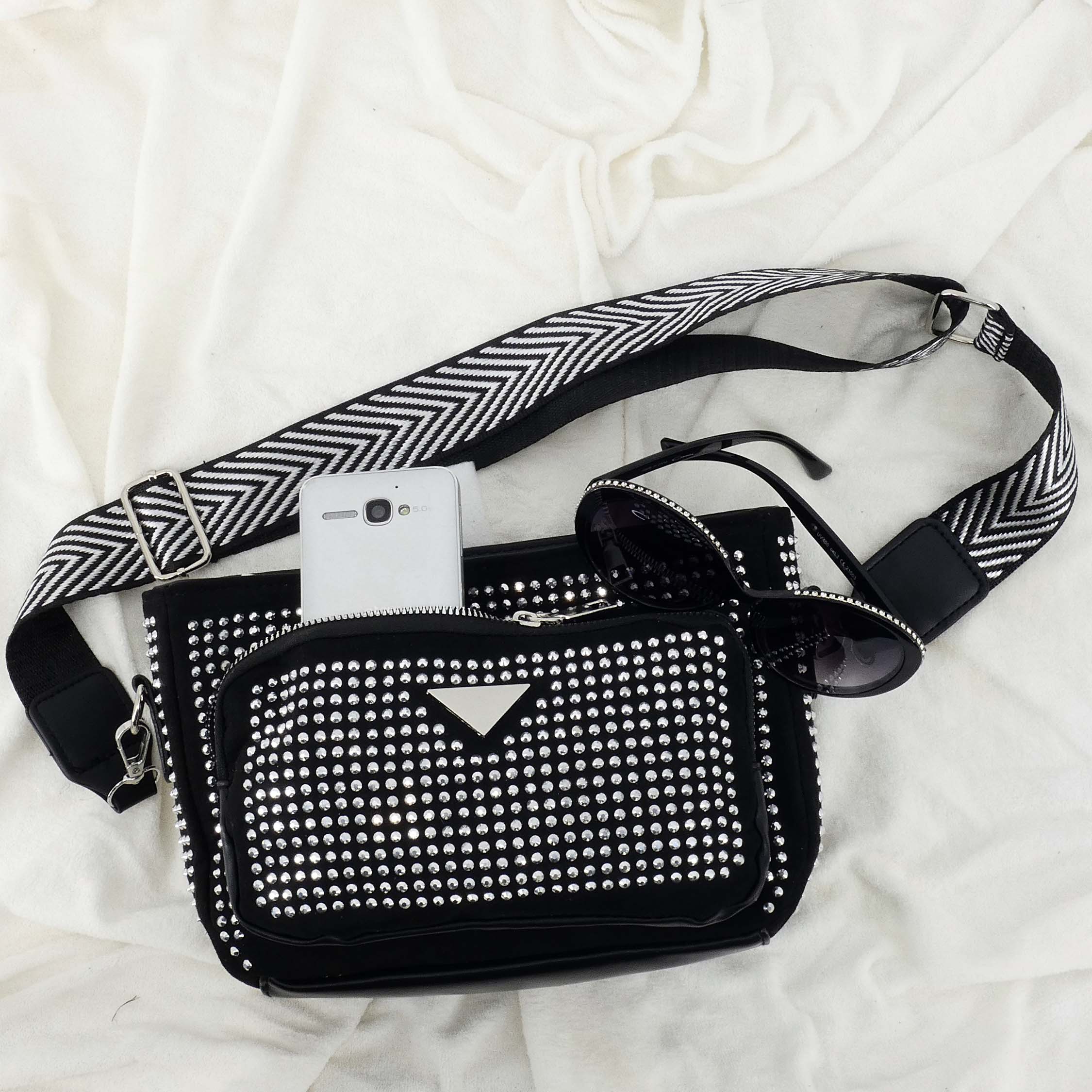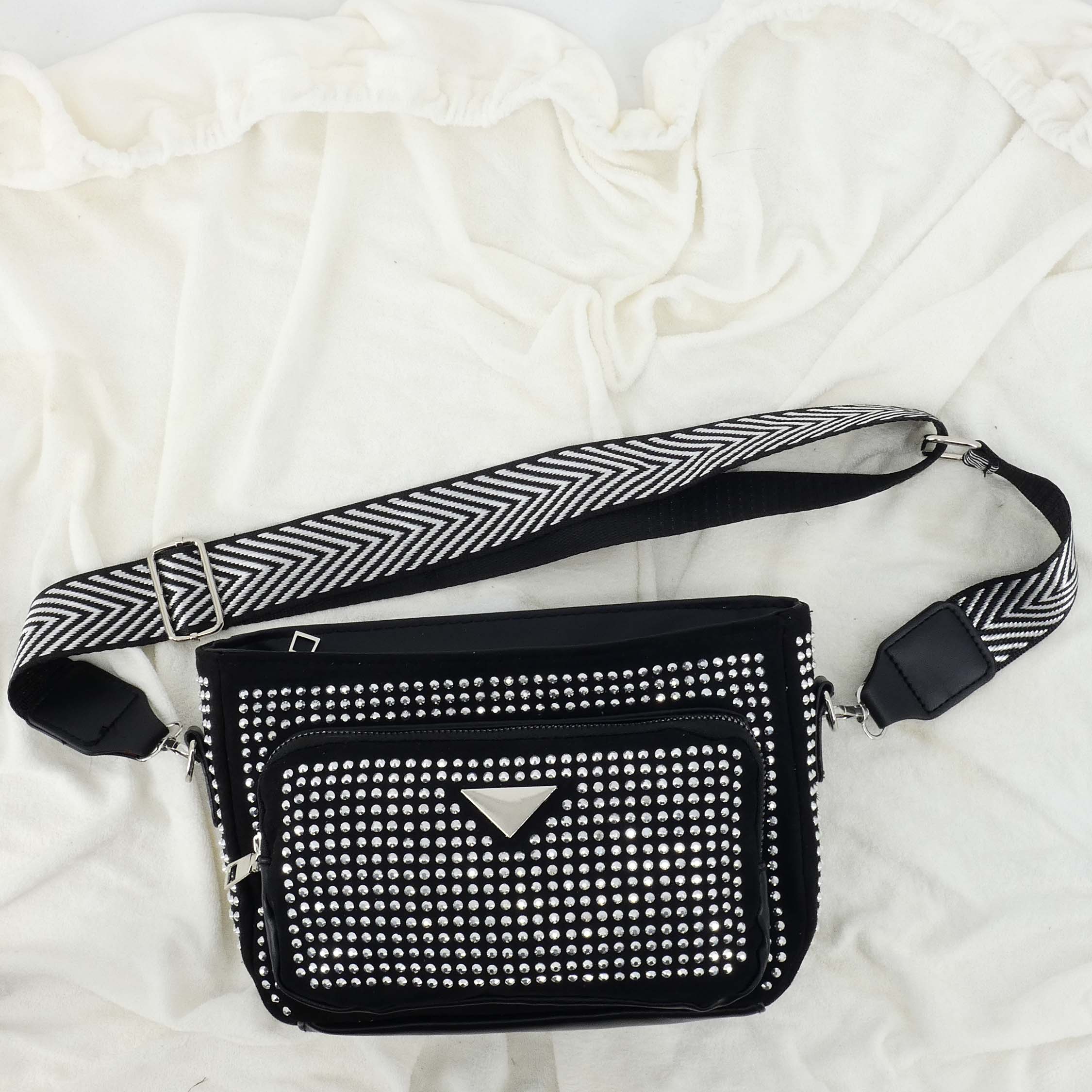 DAMSKA SASZETKA NERKA BAG NA RAMIĘ DWIE KOMORY CYRKONIE PASEK SREBRNA GLAMOUR