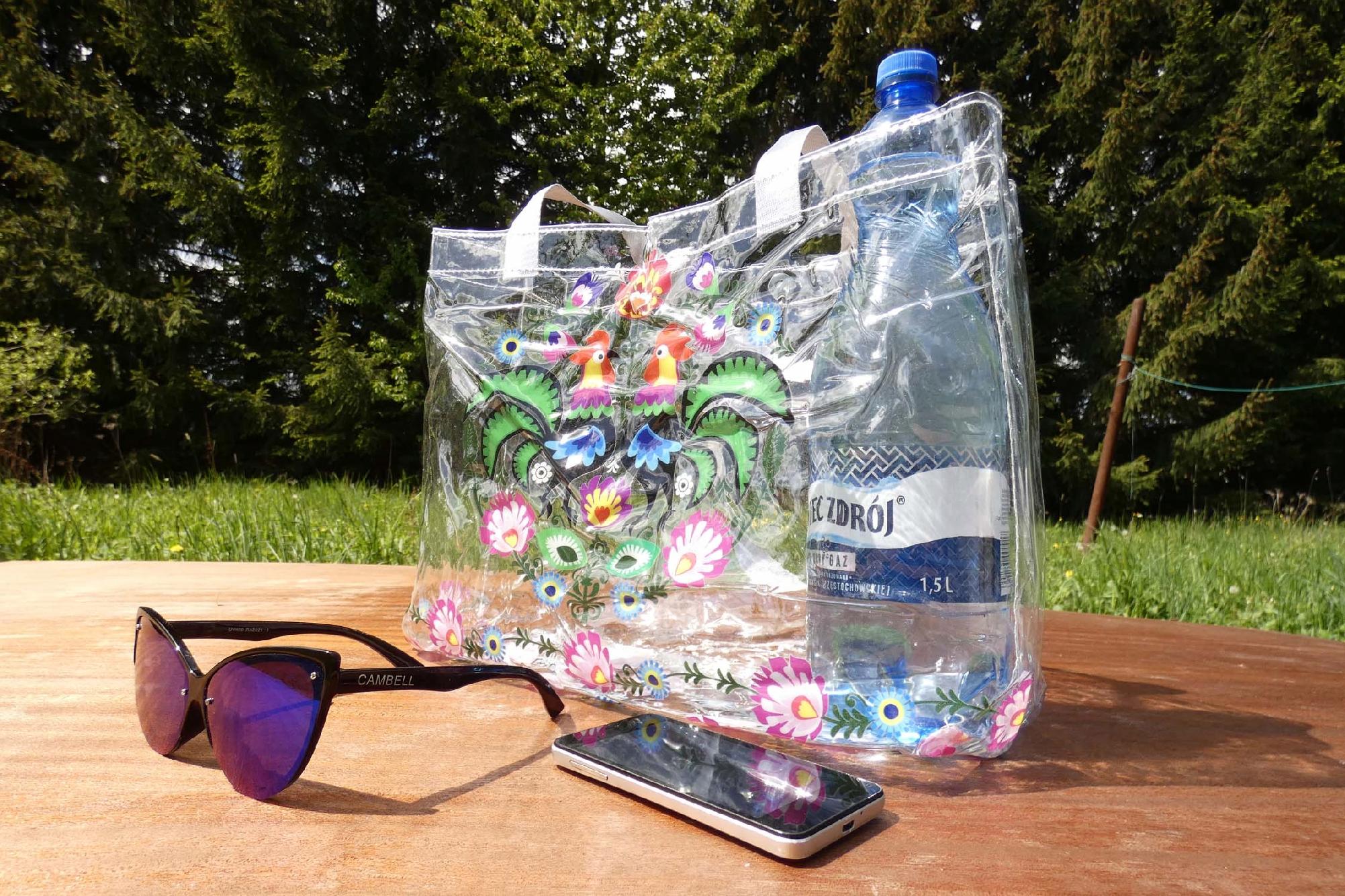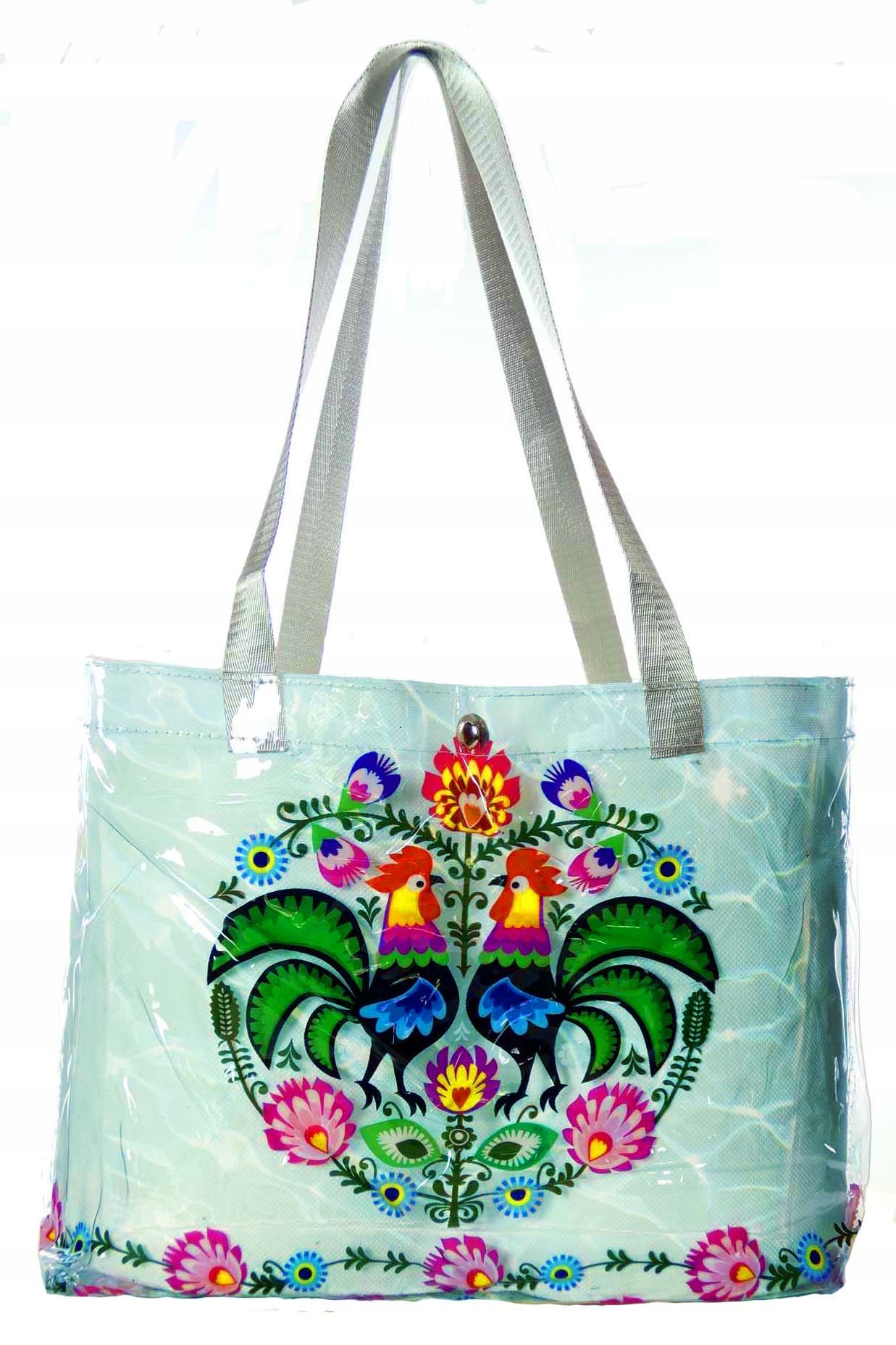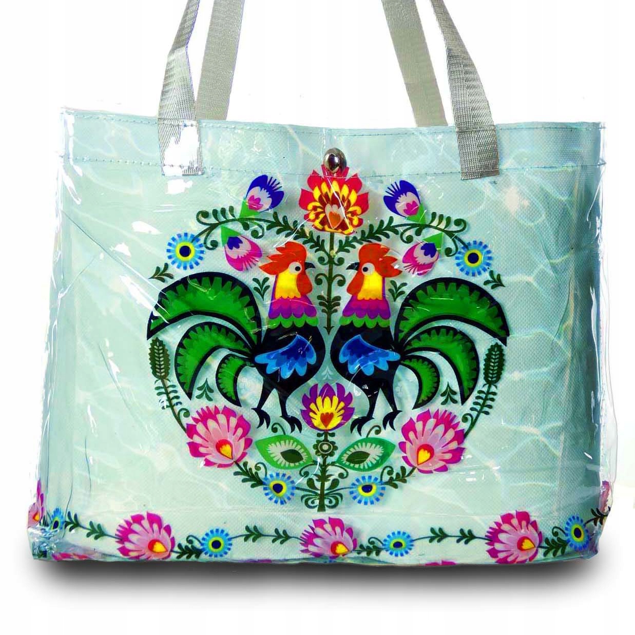 - najmodniejszy motyw sezonu przezroczysta torba na plażę z kolorowym nadrukiem