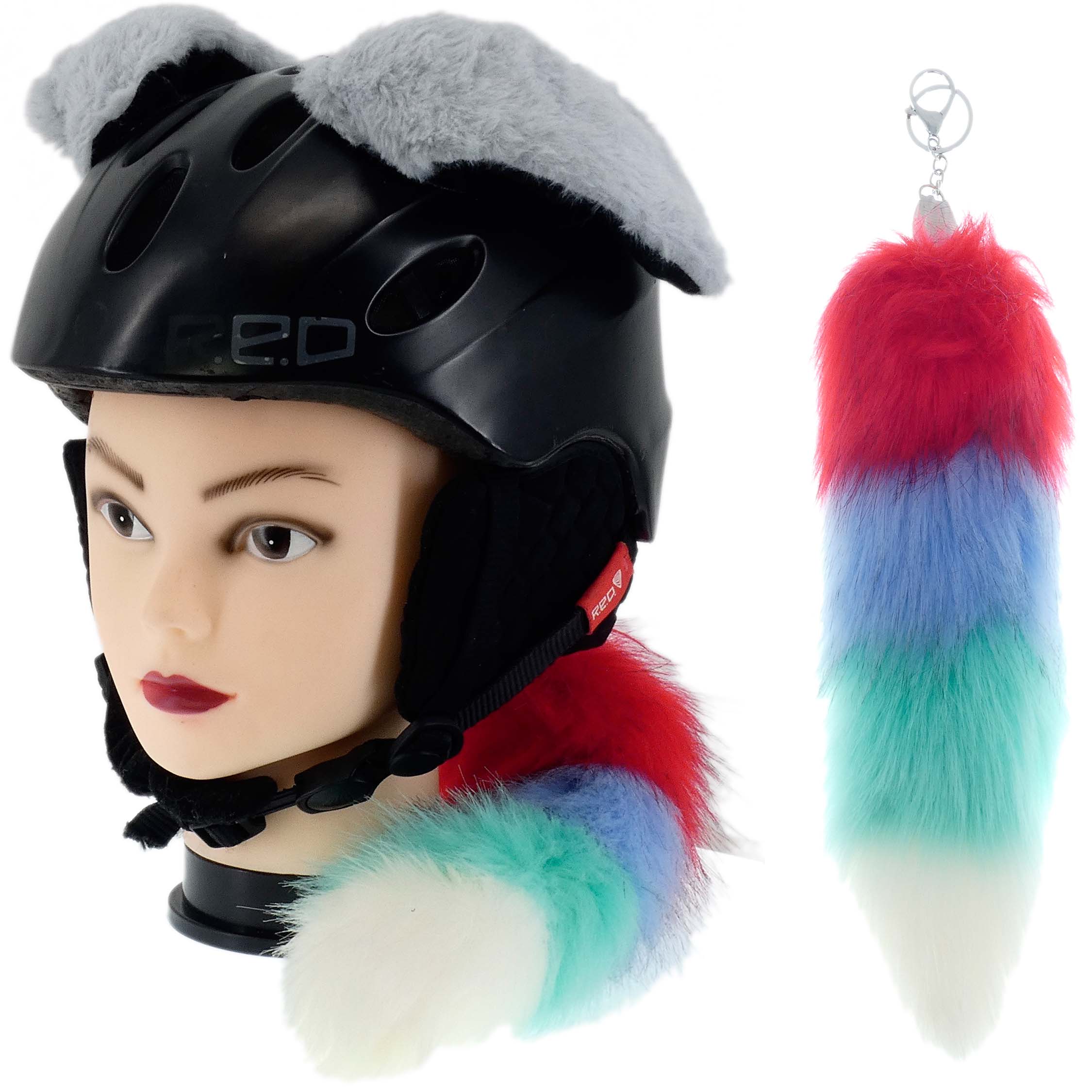 Komplet uszka plus świecąca kita, które można w łatwy sposób zamontować na kasku, na pewno odróżnią cię na drodze, lub stoku narciarskim. Uszka łatwo dają się przy montować w dowolnym miejscu na kasku za pomocą rzepa przyklejanego do kasku. Przypięcie jest bardzo solidne i gwarantujemy ci że nie odpadnie podczas zwykłego użytkowania. Natomiast gdy ci się znudzi, da się łatwo bez dodatkowych narzędzi odkleić. Kitę możesz przypiąć z tyłu do kasku. Kitka wewnątrz ma bateryjkę i diody LED które po włączeniu migają na różna kolory.