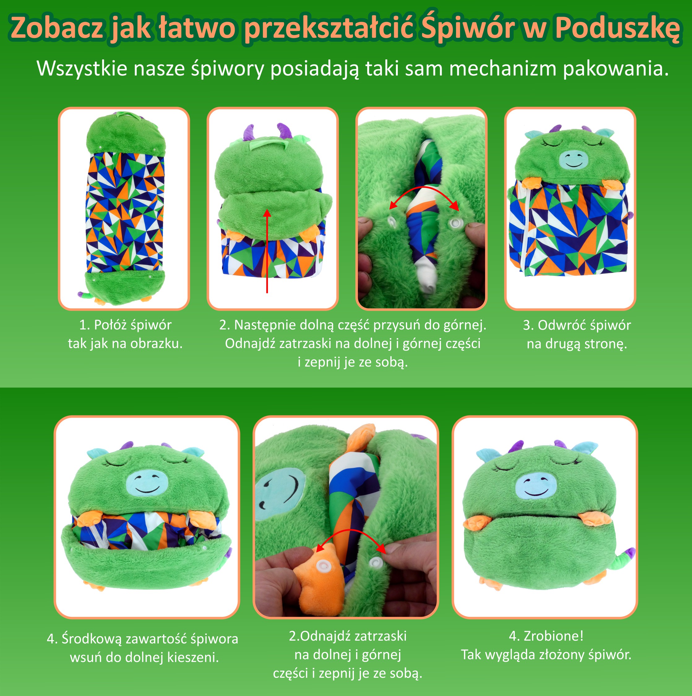Śpiwór dziecięcy składany do formy poduszki. Dla dzieci do 100 cm wzrostu.