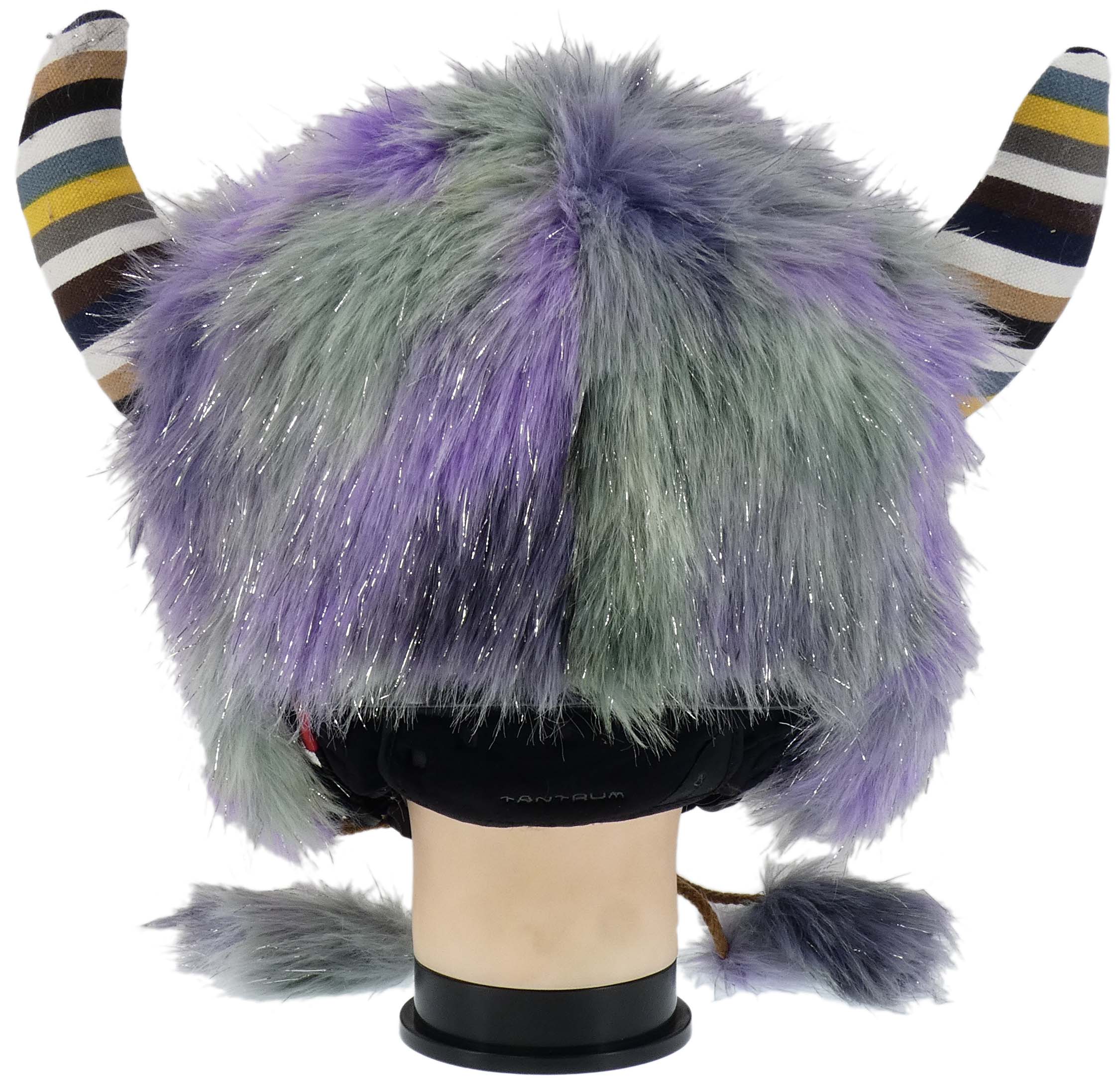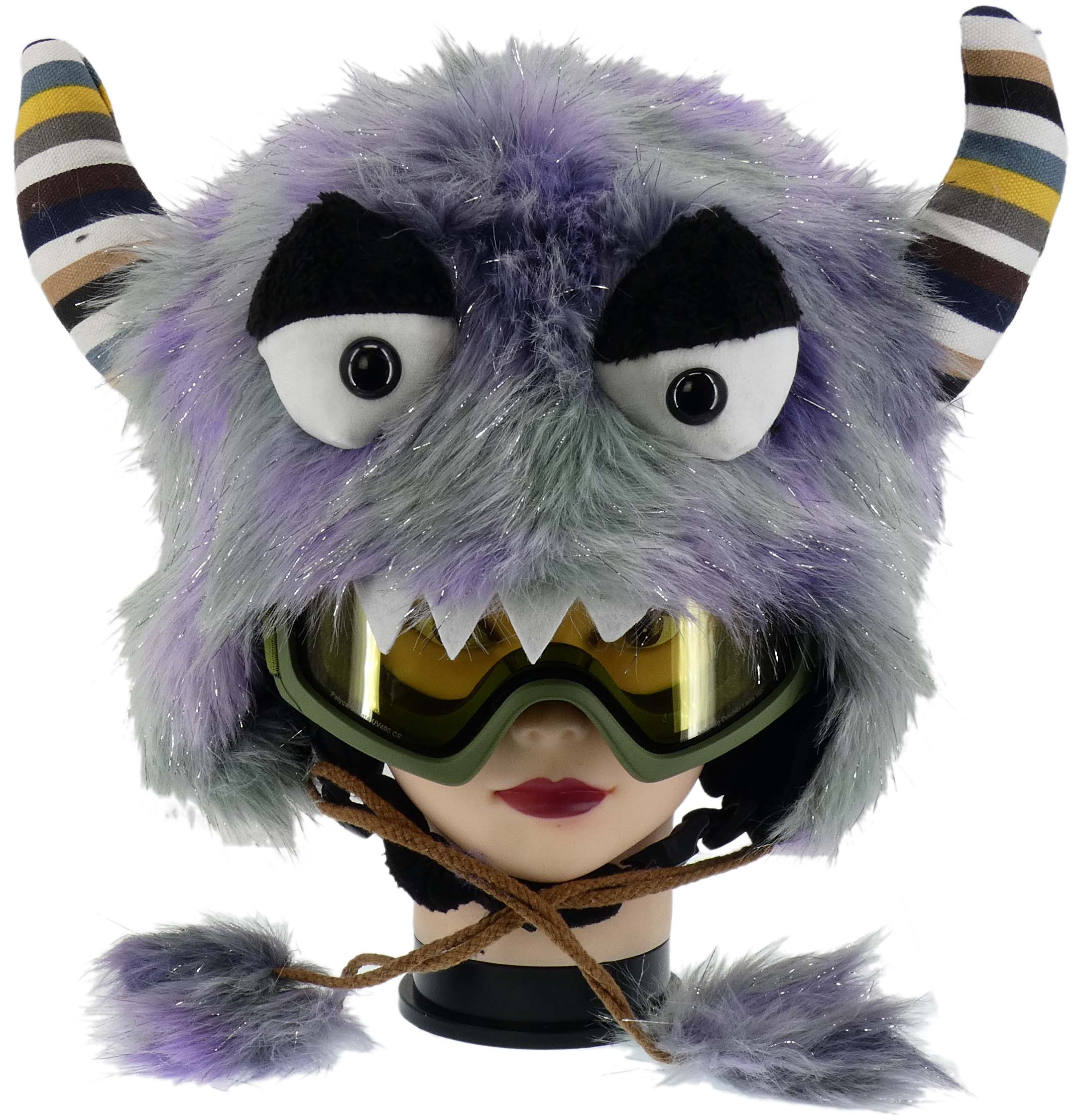 Zabawna czapa zakładana na kask, imitująca rogatego potwora w ciekawej kolorystyce z oczami i miękkimi rogami. Dwa pompony wiszące dopełniają całość. Czapa jest wykonana z sztucznego futra, posiada specjalne gumki po obu stronach, do zaczepienia do kasku oraz przyklejane do kasku naklejki z rzepami, aby podczas szybkiej jazdy nie spadała.